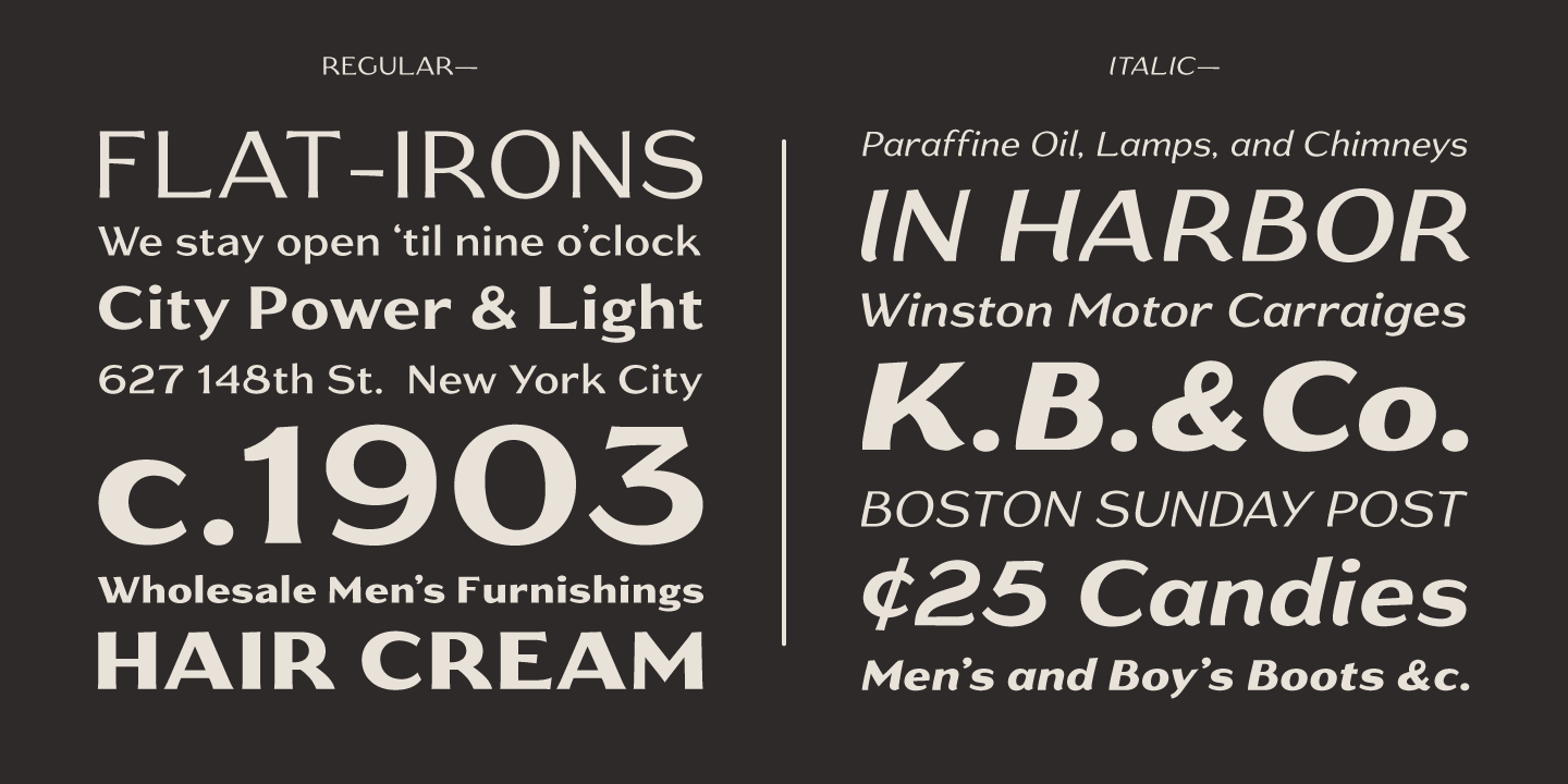 Gaslight is the result of a desire to create a sans-serif rich with humanistic charm and lyrical curves, to provide some relief from the highly rational, low-contrast faces we’re surrounded by at every turn. Gaslight can lend an old-fashioned elegance to product packaging, restaurant signage, or the hull of your grand seafaring vessel.